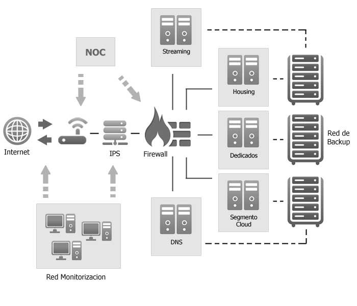 Servidores, controladores de ancho de banda, cortafuegos, sistemas de prevención y detección de intrusiones y una electrónica de red sobredimensionada y redundada diseñada para prestar servicio sin interrupciones y absorver altas cargas de trabajo. Trabajamos con redundancia n+y a todos los niveles core, segmento y rack.